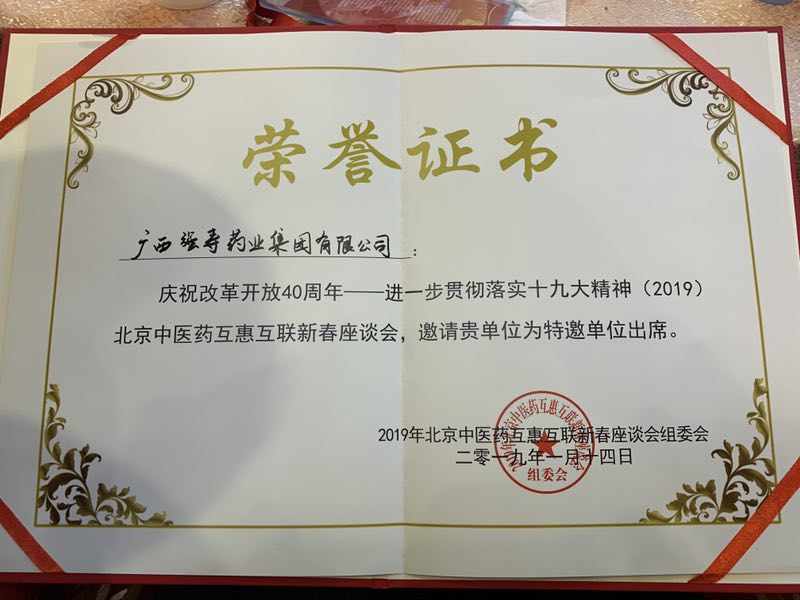 慶祝改革開放40周年——進(jìn)一步貫徹落實(shí)十九大精神(2019),北京中醫(yī)藥互惠互聯(lián)新春座談會(huì),邀請(qǐng)廣西強(qiáng)壽藥業(yè)集團(tuán)有限公司為特邀單位出席。 ????