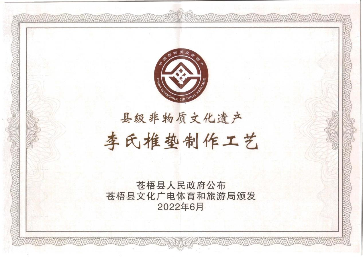 李氏椎墊制作工藝,于2022年6月被列入縣級非物質(zhì)文化遺產(chǎn),證書由蒼梧縣人民政府公布,蒼梧縣文化廣電體育和旅游局頒發(fā)。